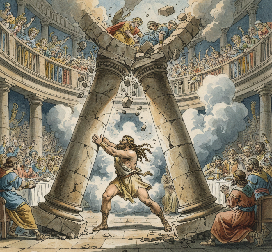 Pero la historia no termina ahí. Durante una gran fiesta en el templo del dios pagano Dagón, los filisteos sacaron a Sansón para burlarse de él. Sansón, arrepentido y con el cabello habiéndole crecido de nuevo, pidió a Dios una última vez: "Señor, acuérdate de mí y dame fuerza solo una vez más". Apoyó sus manos en las dos columnas centrales que sostenían el templo y, empujando con toda su alma, el edificio se derrumbó sobre él y sobre todos los jefes filisteos. En su muerte, Sansón logró una victoria mayor para su pueblo que la que había logrado en toda su vida.