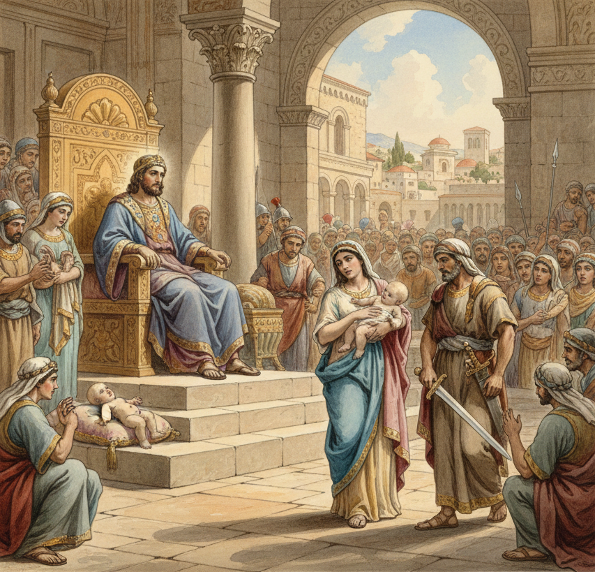 En ese momento, la verdadera madre, movida por un amor desesperado, gritó: "¡No, mi señor! Denle a ella el niño vivo, pero no lo maten". La otra, en cambio, decía: "Ni para mí ni para ti; que lo partan". Salomón entonces dictó sentencia: "Entreguen el niño a la primera mujer, porque ella es su verdadera madre". Todo Israel se llenó de asombro ante la sabiduría que Dios le había dado a su rey para administrar justicia.