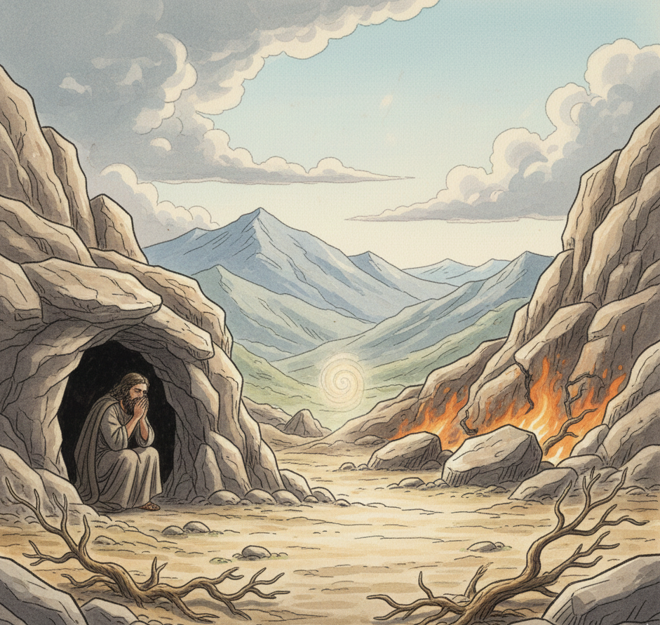 Con esa fuerza, Elías caminó 40 días y 40 noches hasta el Monte Horeb (el Sinaí, donde Dios dio la Ley a Moisés). Allí se escondió en una cueva. De pronto, Dios le dijo: "¿Qué haces aquí, Elías?". Elías se quejó de que se sentía solo y perseguido. Dios le ordenó salir de la cueva. Entonces ocurrió algo asombroso: