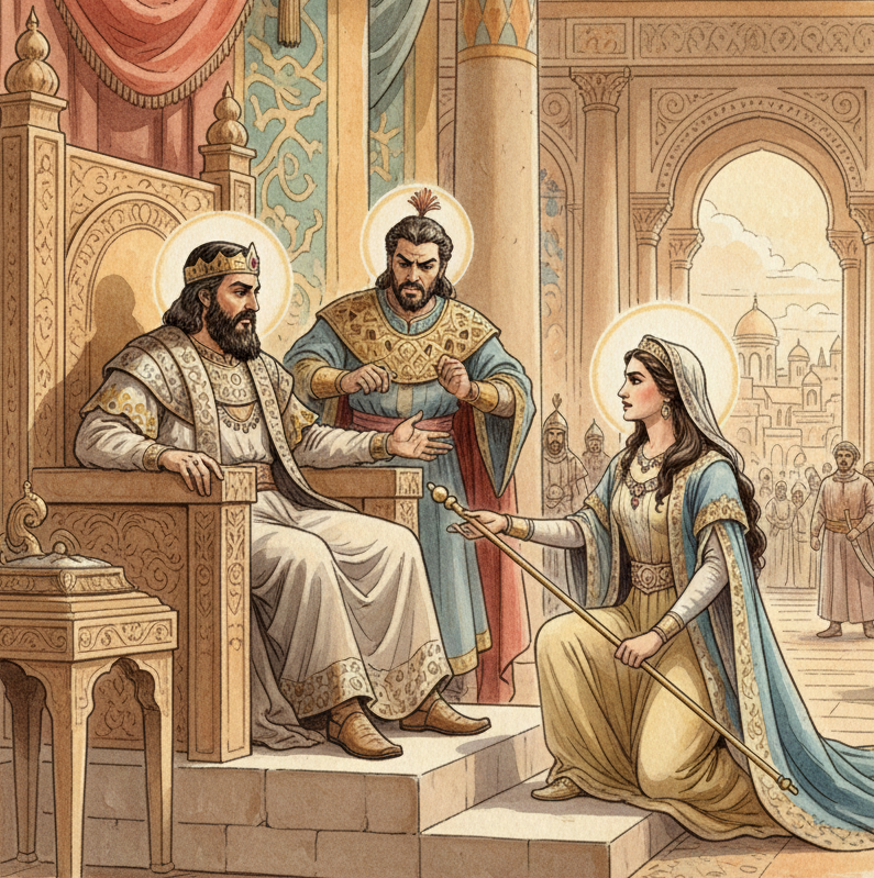Mardoqueo envió un mensaje desesperado a Ester: "No pienses que por estar en el palacio escaparás. ¿Quién sabe si no has llegado al trono precisamente para un momento como este?". Ester, consciente de que presentarse ante el rey sin ser llamada podía castigarse con la muerte, pidió a todos los judíos que ayunaran y oraran con ella durante tres días. Con una valentía heroica, se presentó ante el rey diciendo: "Si tengo que morir, moriré".