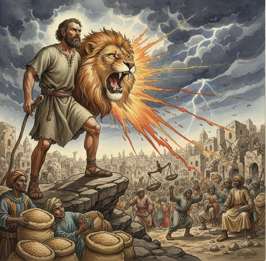 Amós utiliza un lenguaje impactante: compara la voz de Dios con el rugido de un león que sale de Sión para defender a sus hijos oprimidos. El profeta denuncia que Dios aborrece los ritos religiosos y las canciones hermosas si no van acompañados de justicia. Para Dios, la verdadera religión no es solo rezar en el templo, sino "dejar que el derecho corra como el agua y la justicia como un torrente inagotable". Amós advierte que una sociedad que ignora el sufrimiento del necesitado está condenada a la ruina espiritual.
